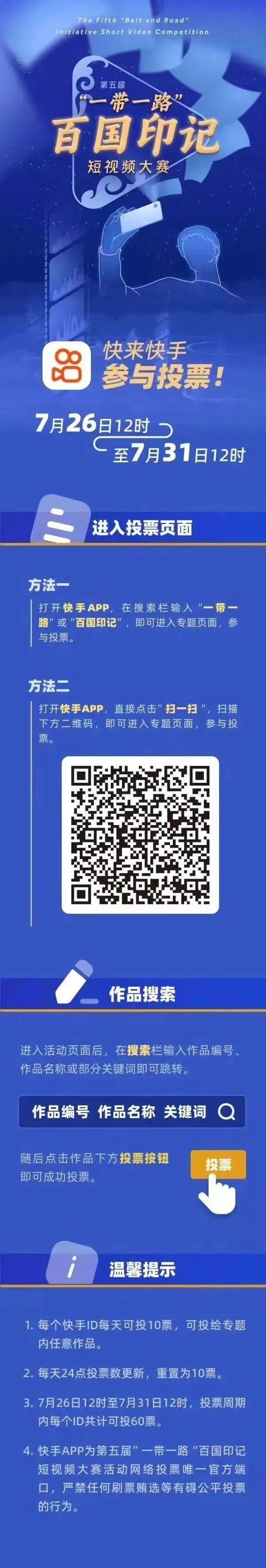 7月26日,由外交部新聞司、中央網(wǎng)信辦網(wǎng)絡(luò)傳播局指導(dǎo),中國(guó)公共外交協(xié)會(huì)、國(guó)務(wù)院國(guó)資委新聞中心、環(huán)球網(wǎng)聯(lián)合主辦的第五屆“一帶一路”百國(guó)印記短視頻大賽完成作品征集,正式開(kāi)啟投票階段。