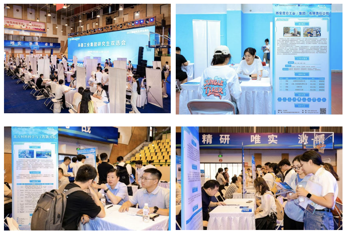畢業(yè)生代表回顧成長(zhǎng)歷程,感謝培養(yǎng)平臺(tái)與導(dǎo)師指導(dǎo),誓言投身國(guó)防事業(yè)。導(dǎo)師代表肯定學(xué)生科研淬煉的“嚴(yán)謹(jǐn)”與“擔(dān)當(dāng)”,寄語(yǔ)傳承人民兵工精神,在強(qiáng)軍報(bào)國(guó)中實(shí)現(xiàn)價(jià)值。校友代表以科研經(jīng)歷詮釋兵工人使命,勉勵(lì)學(xué)弟學(xué)妹以裝備成果接力書寫強(qiáng)軍報(bào)國(guó)答卷。全體師生共同唱響《強(qiáng)軍有我》,鏗鏘有力的歌聲回蕩在體育館內(nèi),既飽含著對(duì)青春理想的告白,更傳遞出投身國(guó)防事業(yè)的堅(jiān)定信念,為這場(chǎng)畢業(yè)盛典增添了厚重的使命底色。 典禮的莊重氛圍未散,兩場(chǎng)精準(zhǔn)對(duì)接國(guó)防需求的雙選會(huì)已在相鄰場(chǎng)館同步開(kāi)啟。60家集團(tuán)公司下屬單位的招聘人員與2025屆畢業(yè)生、在讀研究生及工程碩博士們圍坐洽談,圍繞崗位需求與項(xiàng)目方向,以簡(jiǎn)歷和科研成果為媒展開(kāi)深度對(duì)接。這場(chǎng)覆蓋多層次人才的就業(yè)服務(wù),精準(zhǔn)銜接科研人才儲(chǔ)備與國(guó)防需求,為兵器事業(yè)高質(zhì)量發(fā)展注入活力。